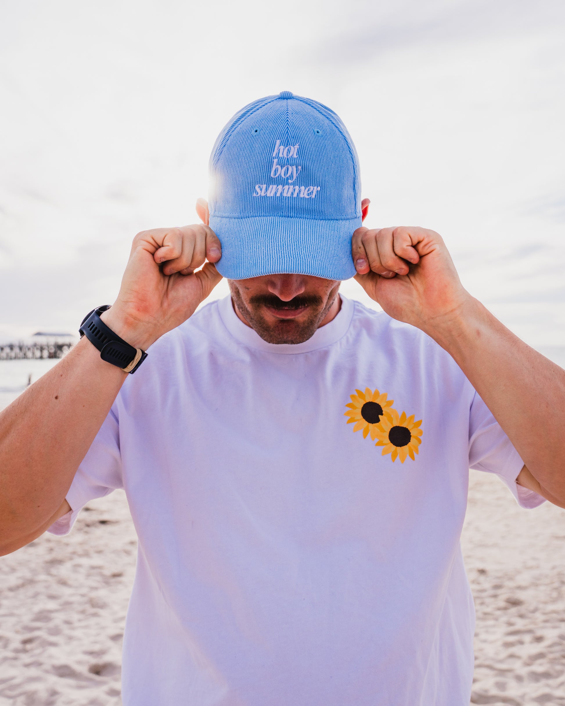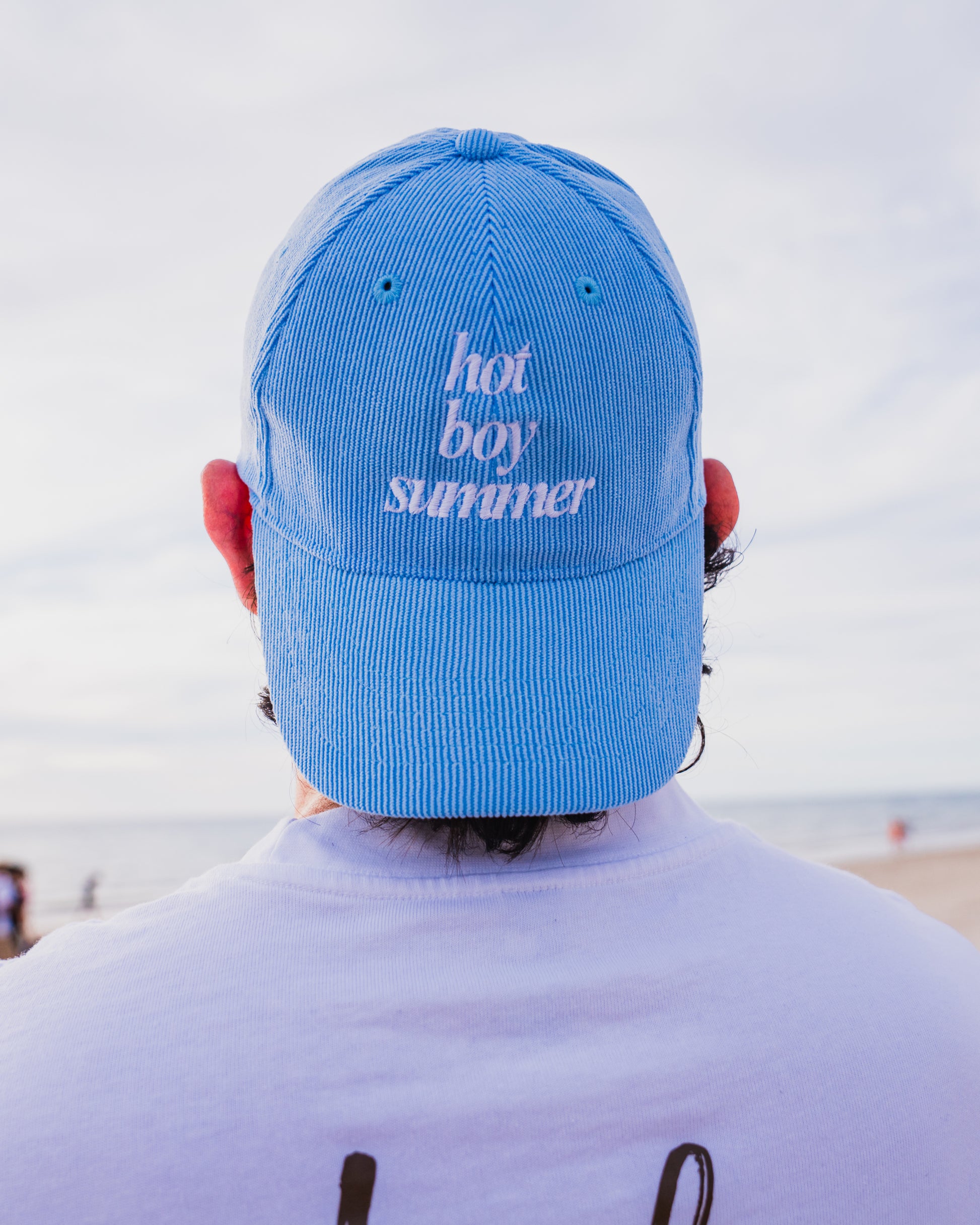Stay out of the sun with our Hot Boy Summer Hat. This retro corduroy cap features a high-quality embroidered design on the front. The pale blue hat embodies the essence of summer, with the soft blue of the sea meeting the white sands of Henley. It's a must-have for your days at the beach.